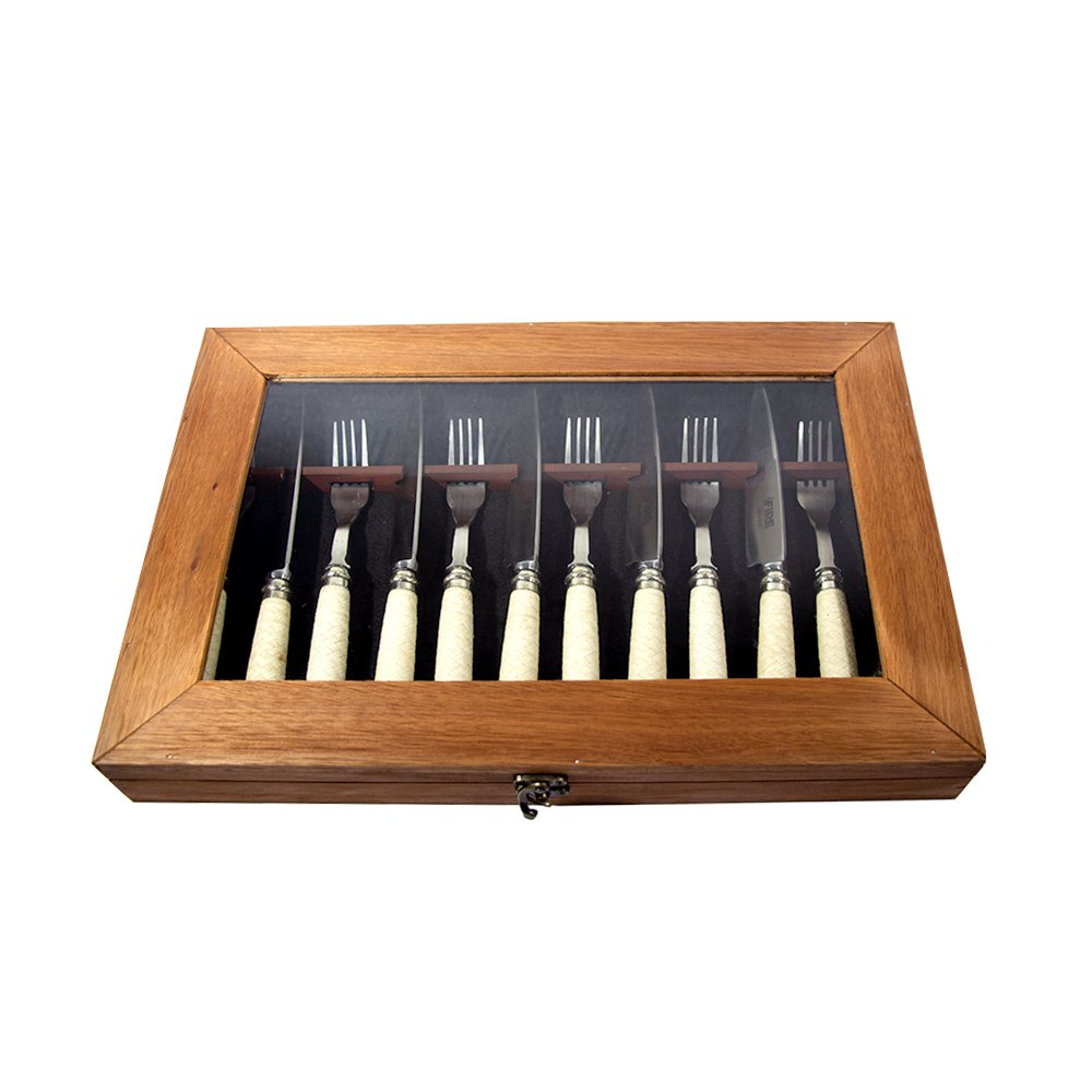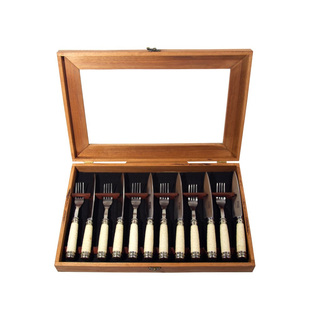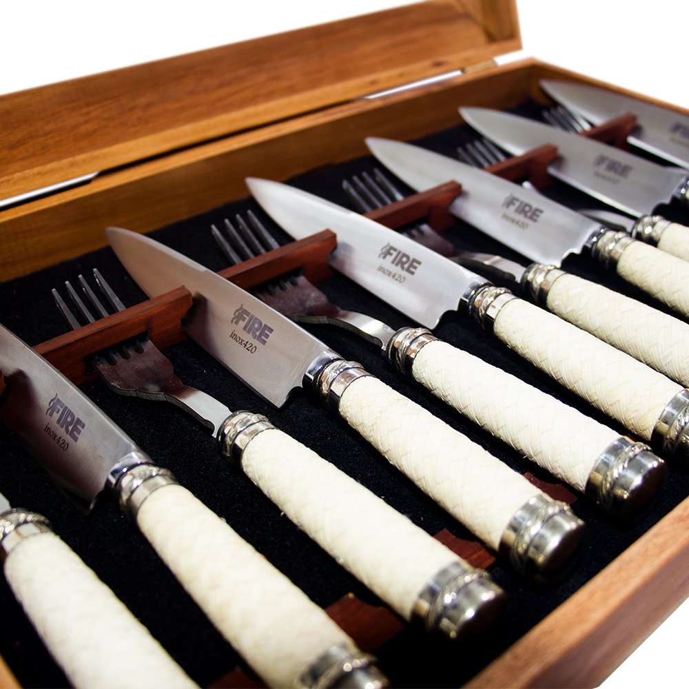 SET CUBIERTOS MESA : 6 comensales COMPOSICIÓN HOJA : Acero Inoxidable 420 Templado TAMAÑOSDE HOJA: 14 Cm. CAJA: Madera MANGO : Cuero trensado y Alpaca MARCA : FIRE