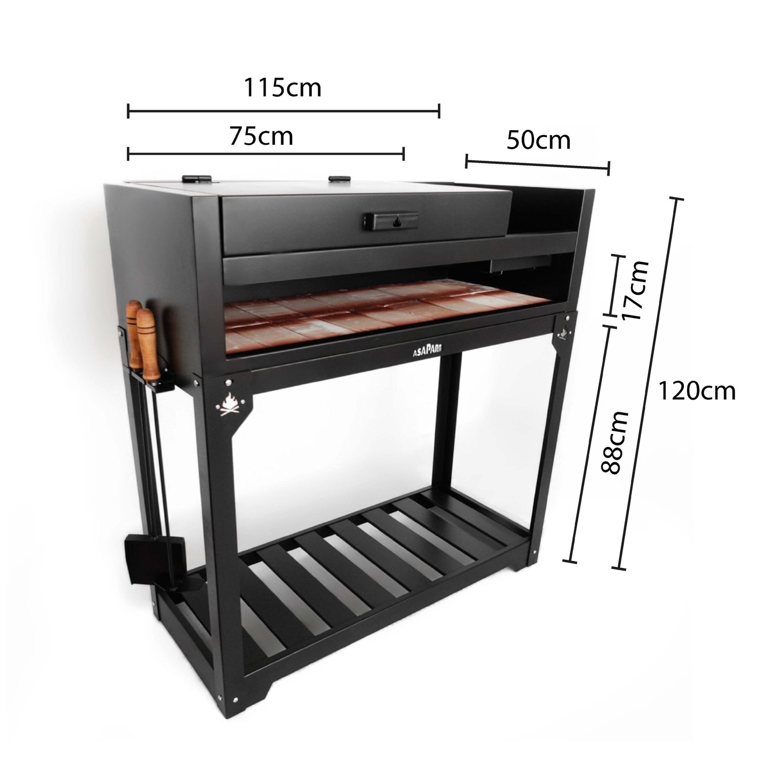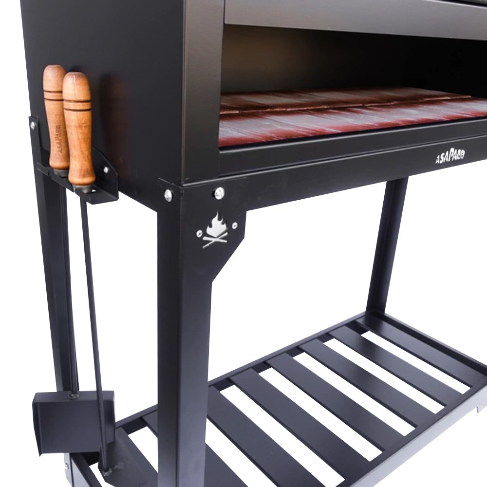 Material: Chapa negra de 2.5mm, tapa de 2mm, con sistema de apertura de 3.2mm. Posee un tratamiento de pintura profesional resistente a la intemperie y alta temperatura, 800 grados.