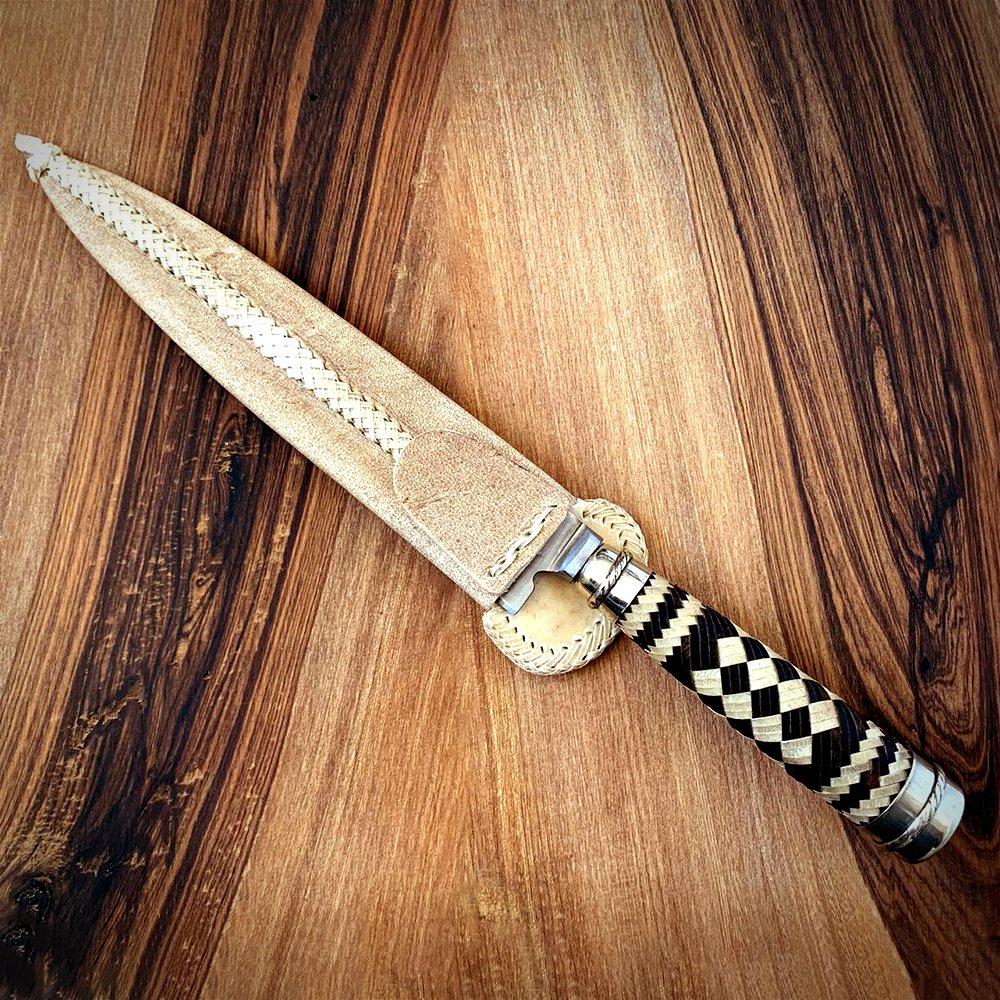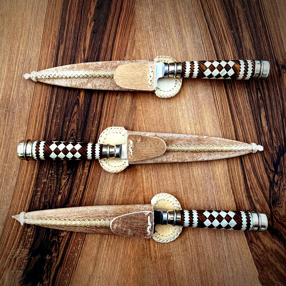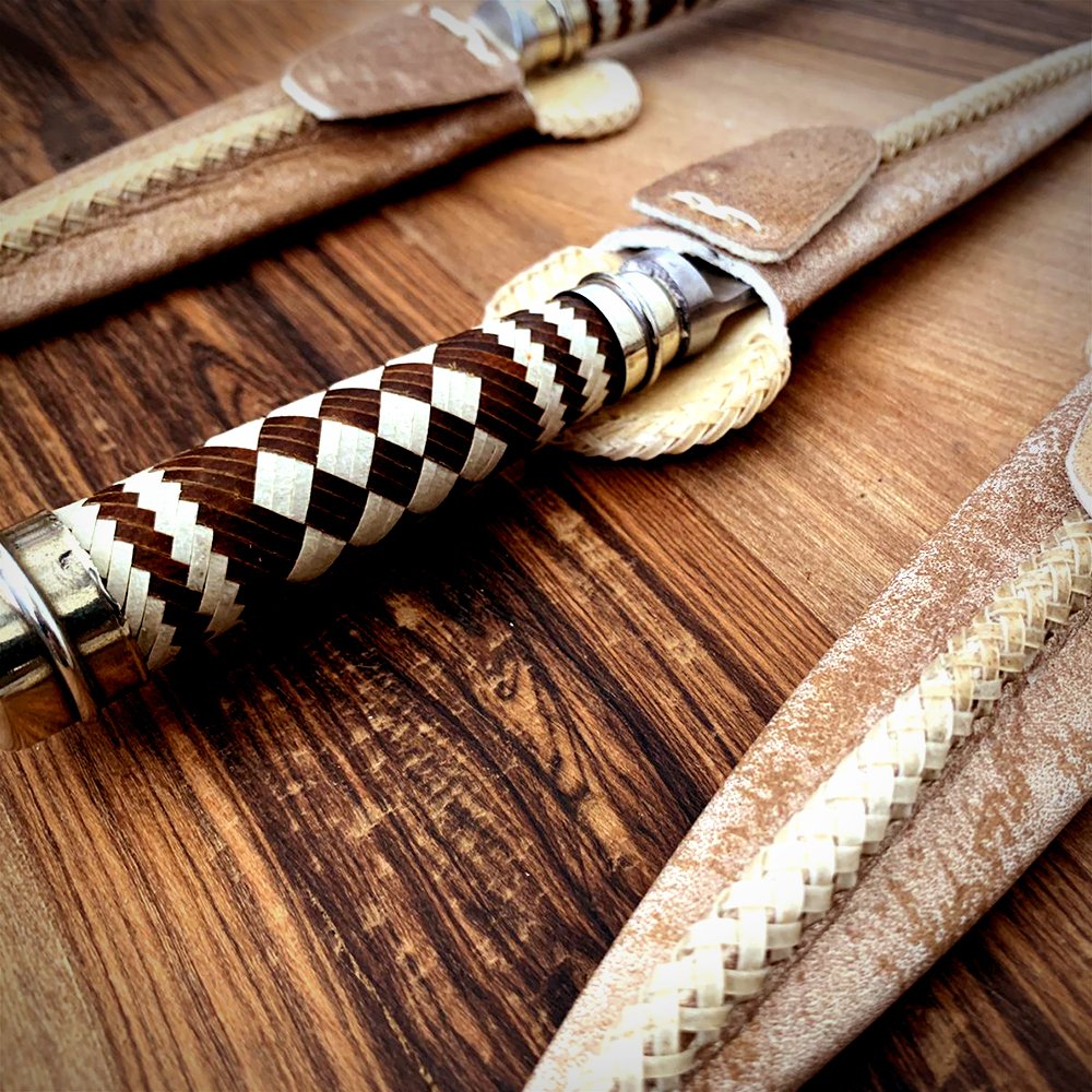 CABO TRENZADO TIENTO: EL MANGO DEL CUCHILLO ES DE TRENZADO TIENTO, 100% CUERO NATURAL, COMBINANDO COLORES, CUERO CRUDO CON CUERO OSCURO, CON FINAS TERMINACIONES DE ALPACA, AÑADIENDOLE UN TOQUE DE ELEGANCIA Y SINGULARIDAD A CADA PIEZA.