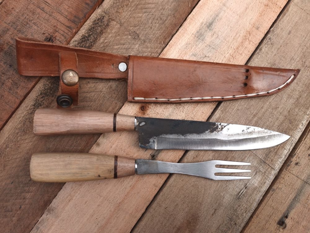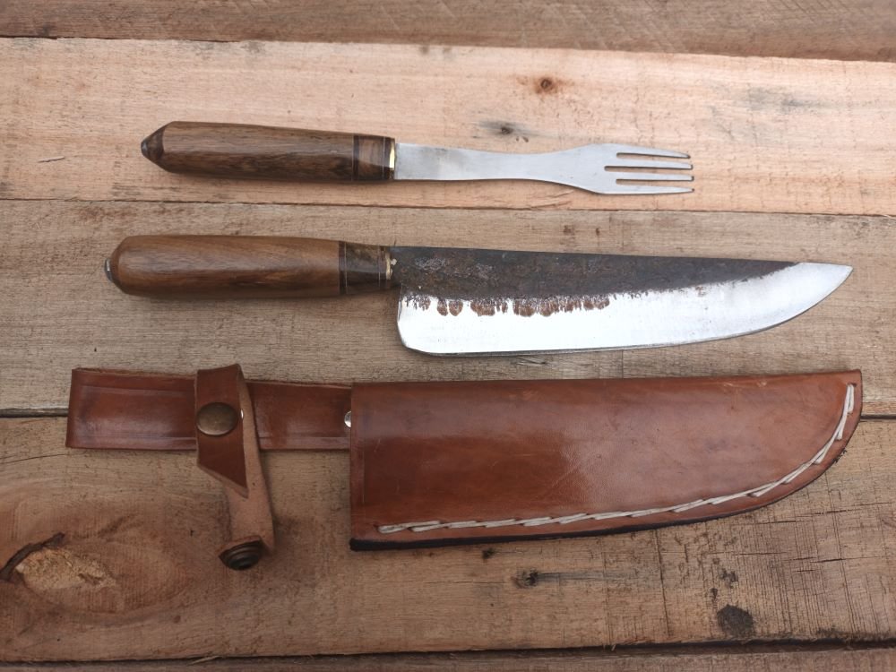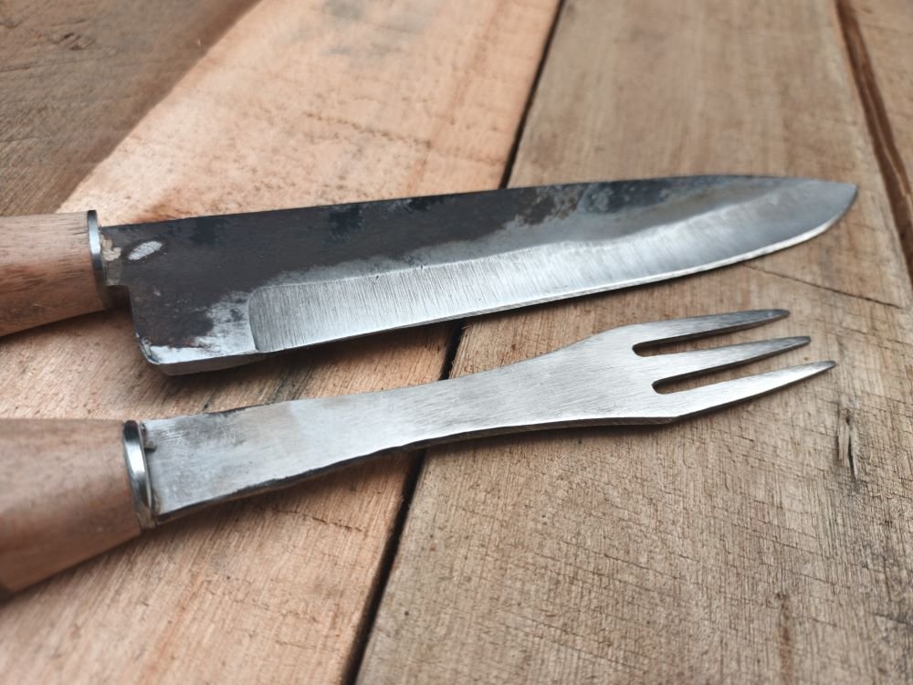 DESCRIPCIÓN: Set de cubiertos artesanales, fabricado en Argentina a partir de discos de Arado. Posee una hoja en acero al carbono templado y terminación rústica, con mango de madera.