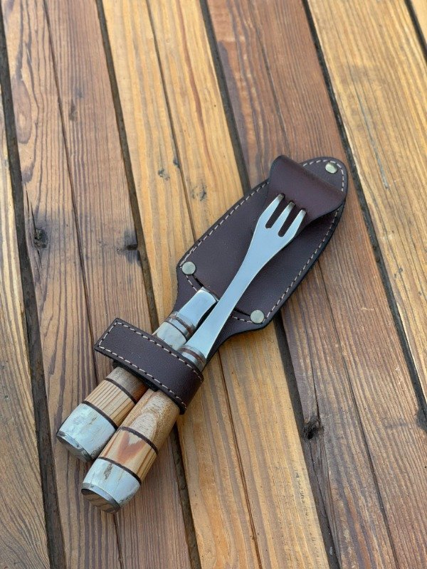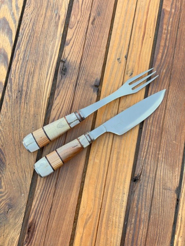 DESCRIPCIÓN: Set de tenedor y cuchillo artesanales, fabricados en Argentina. Poseen una hoja en Acero Inoxidable con templado y pulido espejo.