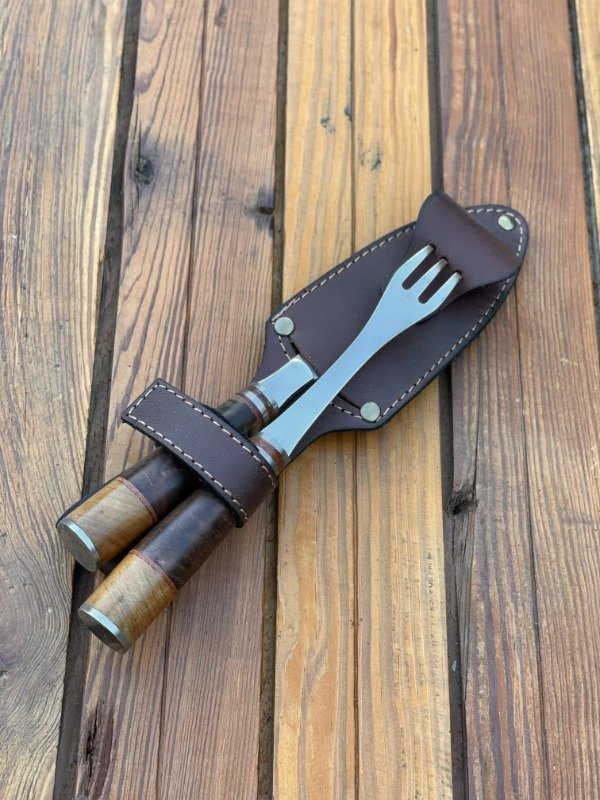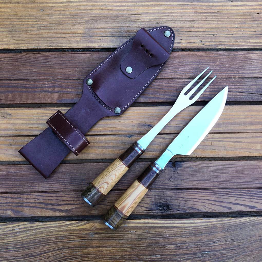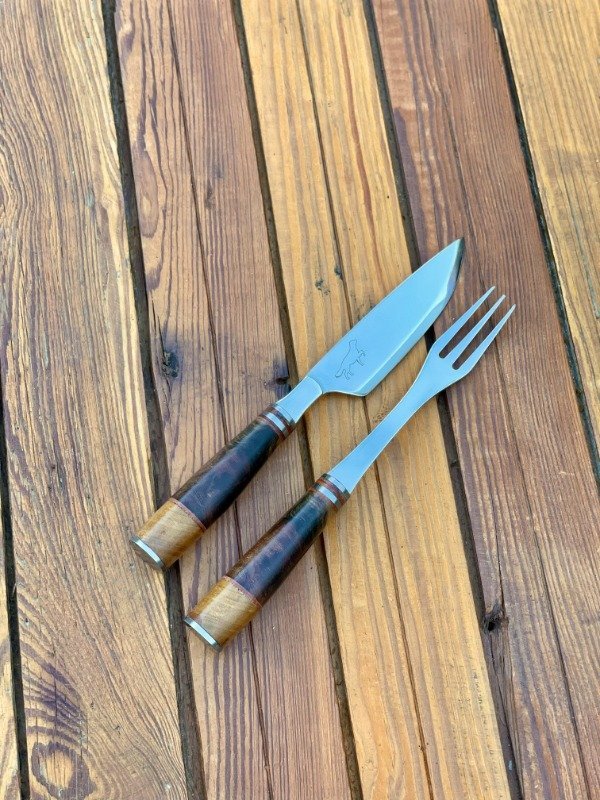 DESCRIPCIÓN:    Set de tenedor y cuchillo artesanales, fabricados en Argentina.  Poseen una hoja en Acero Inoxidable con templado y pulido espejo.