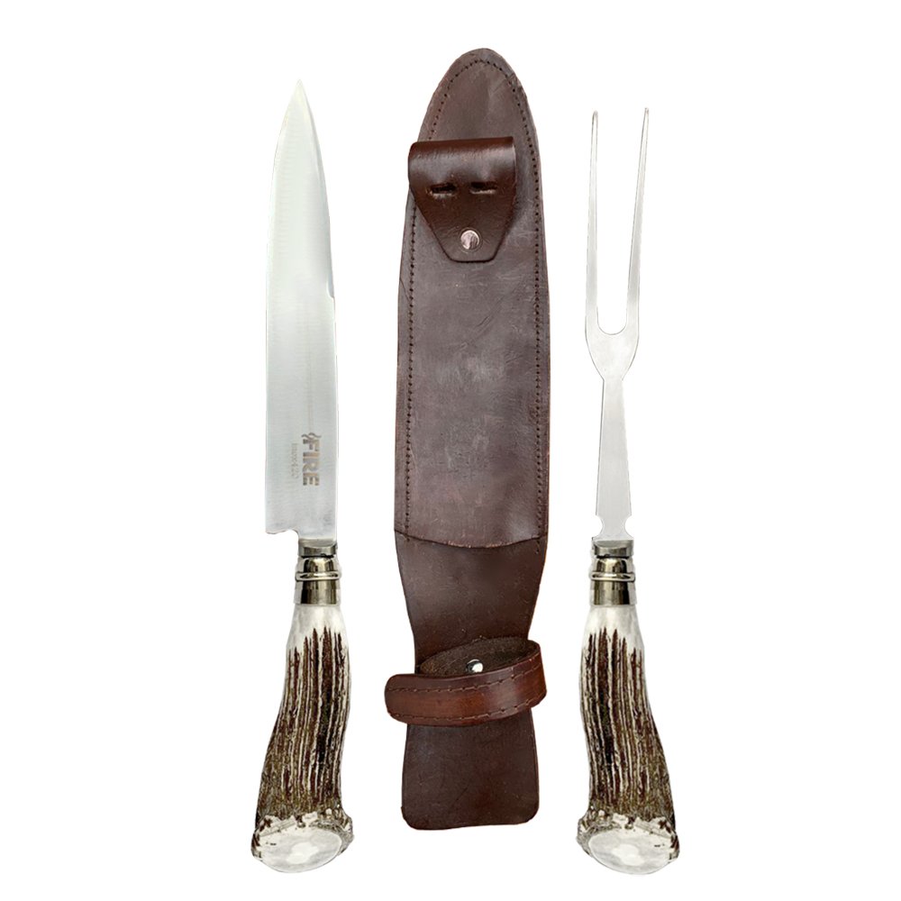 HOJA : Acero Inoxidable 420 Templado. TAMAÑOSDE HOJA : 20 Cm. VAINA : Cuero Café Oscuro. MANGO:Roseta/Asta de ciervo/Madera alpaca. MARCA:FIRE.